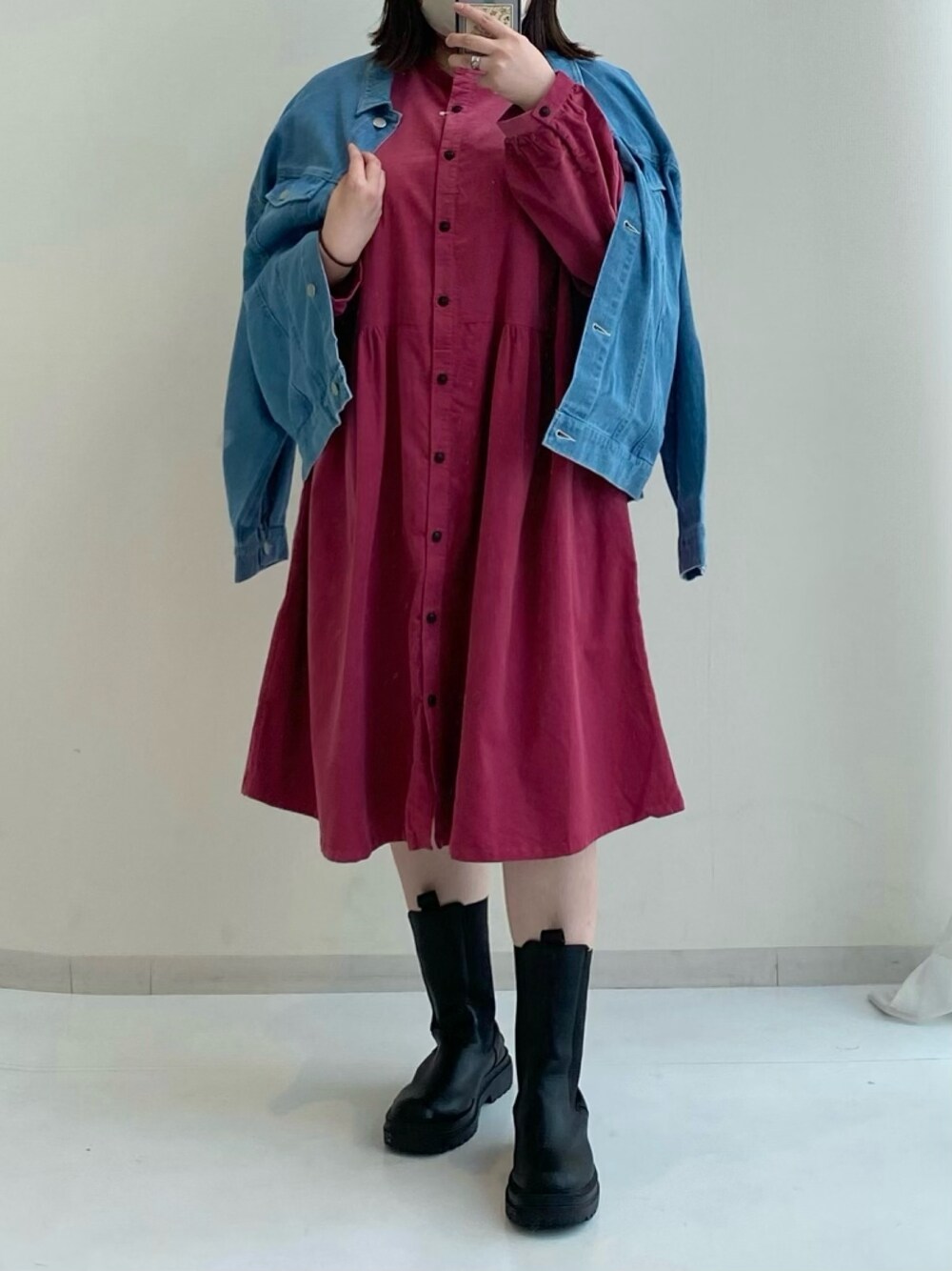 秋冬コーデに欠かせないコーデュロイ生地のゆるシルエットワンピース! 着丈がやや短めなので長めのブーツと合わせました。