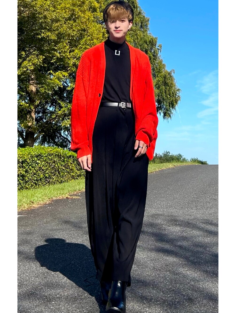 🟧✖️🔳の統一コーデです! タートルネックのメタルパーツがネックレスのように見えてコーデの良さを引き立ててくれます♪ 🟥のテーラードジャケットのようにカジュアルなカーディガンをモードな雰囲気の中に落とし込むことで中和を狙ってみました✨