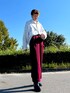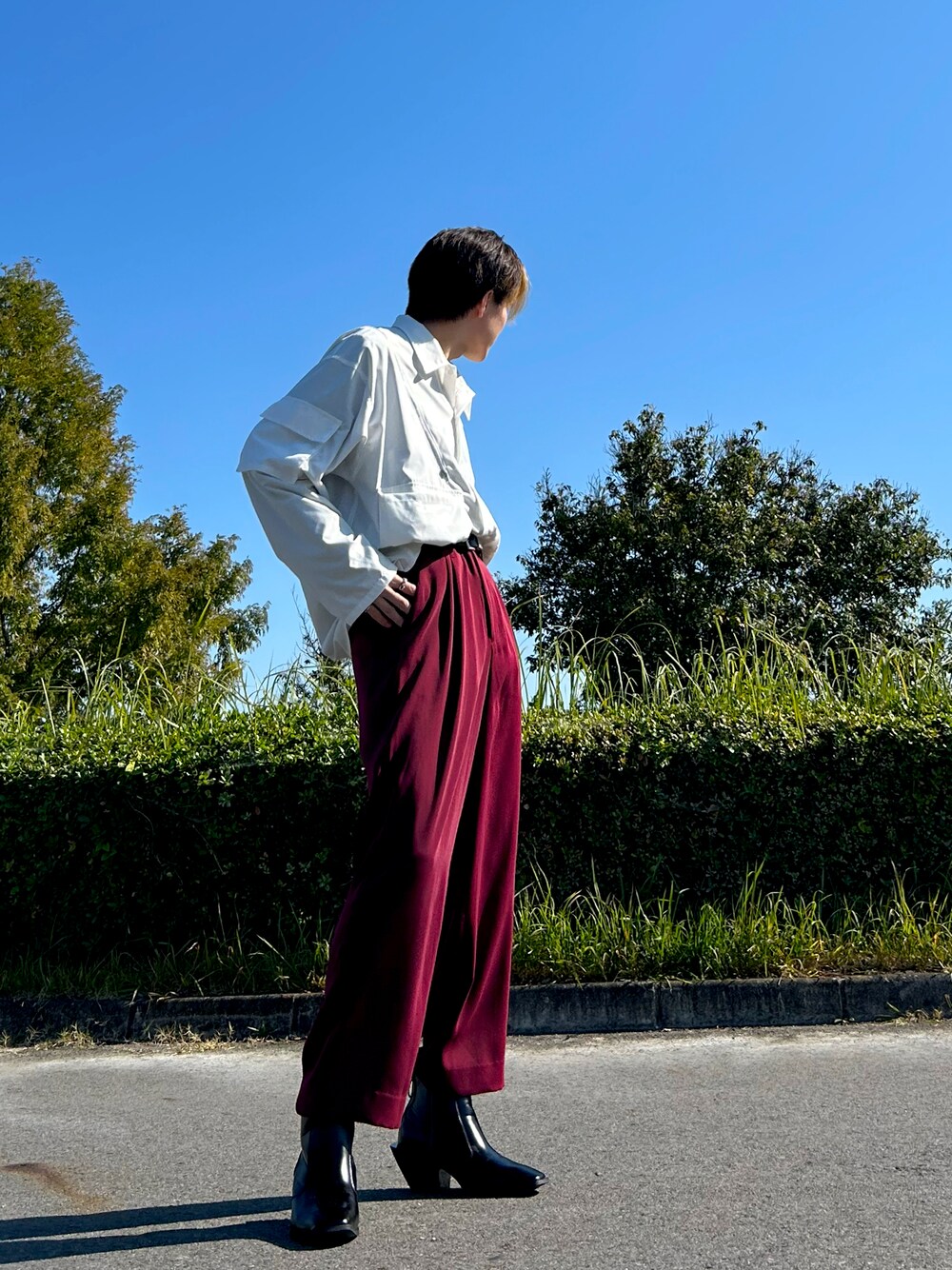 白シャツ✖️赤🟥スラックスコーデ‼️ スラックスのとろっとした光沢感と白シャツの印象が、上品なコーデになっています✨ 昭和のようなレトロな雰囲気を感じるコーデになっています。