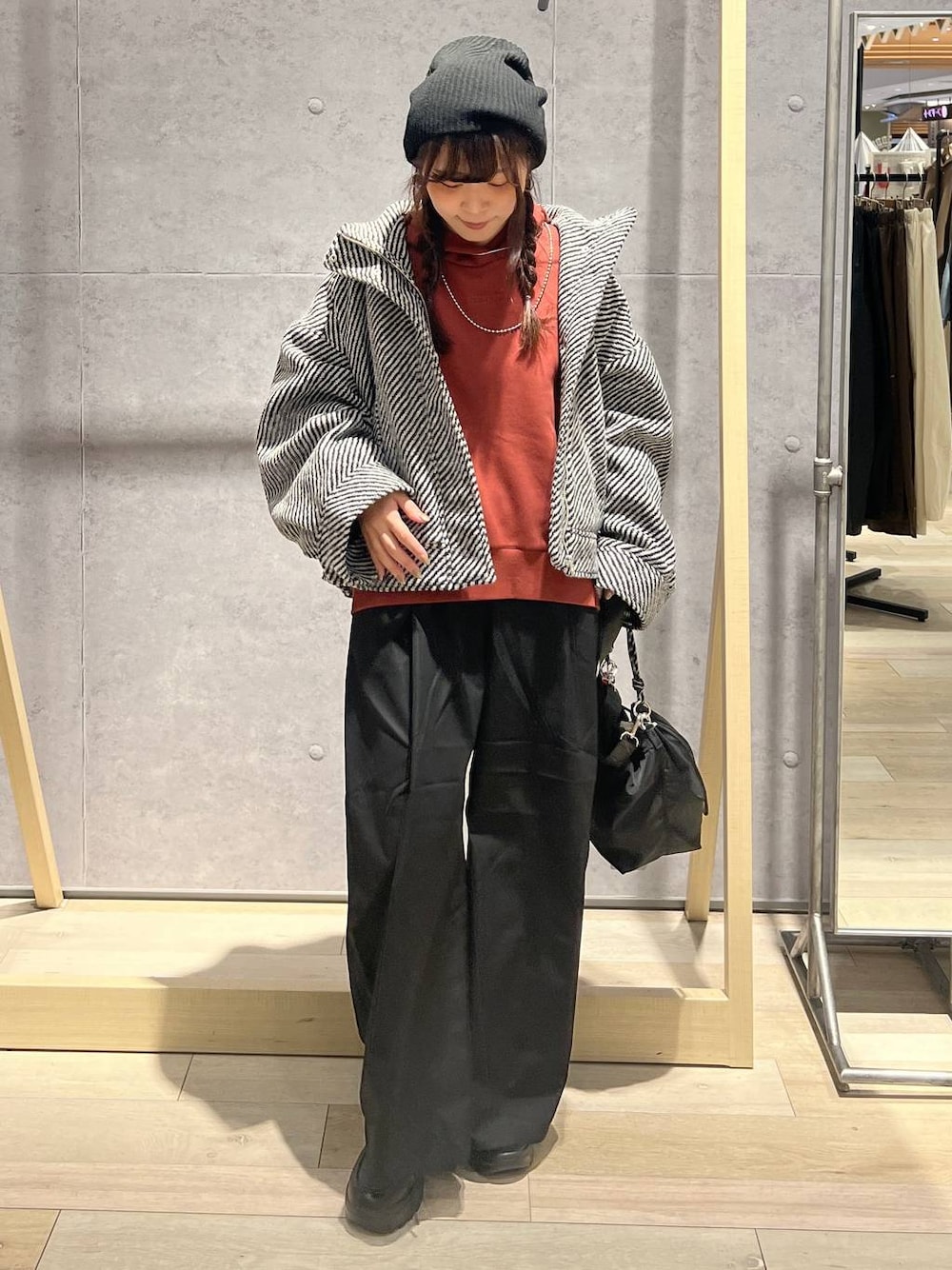 【カジュアルコーデ】 人気のスライバーブルゾンを使ったコーデ✨️ インナーはパッと明るく見えるオレンジのパーカーでメリハリ出ます🧡 ボトムと小物は黒で統一🖤 そろそろアウター探そうかな、、と思われてる方には どんなコーデにも合うスライバーブルゾンが本当におすすめです!