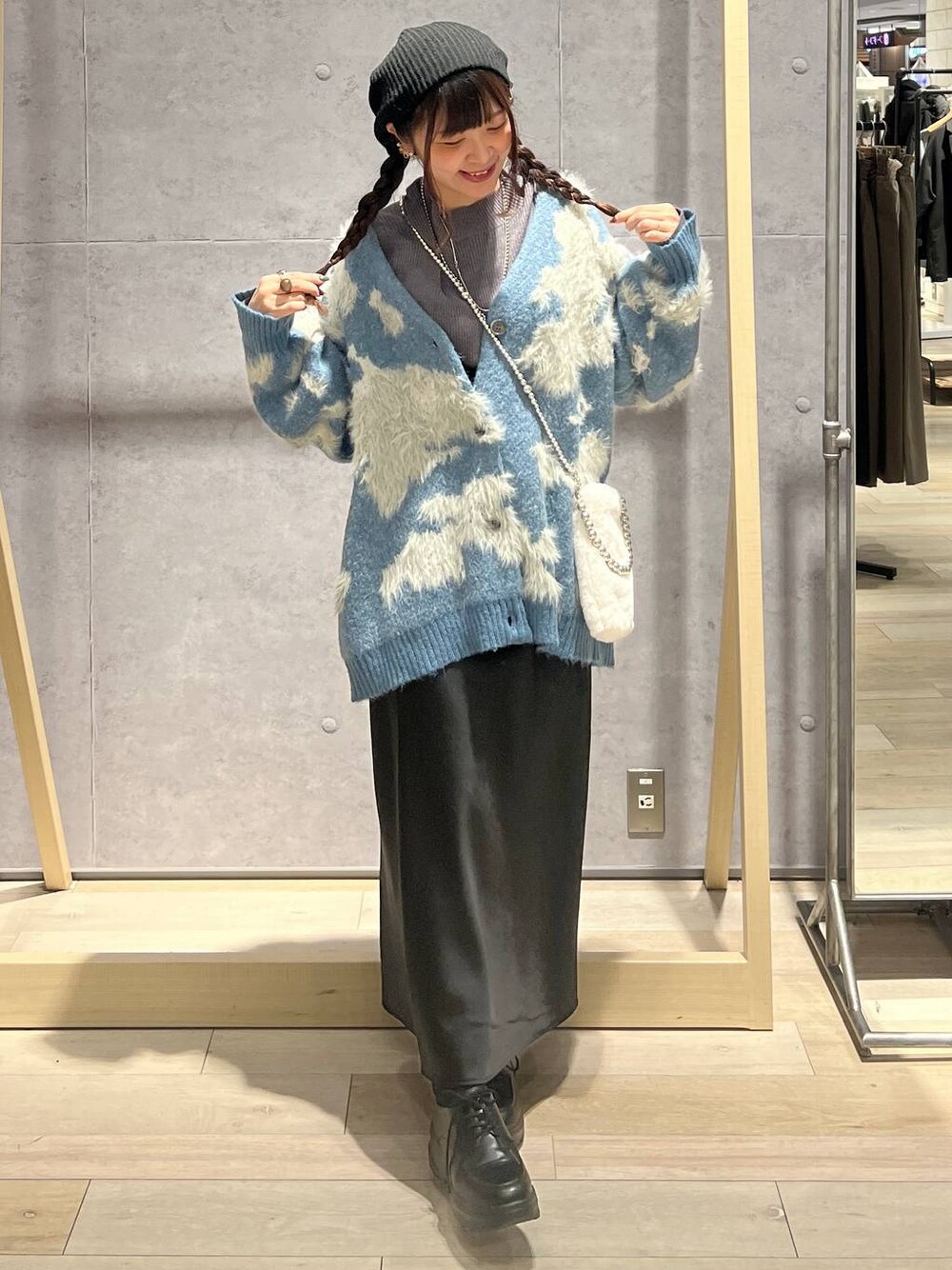 【キレイめカジュアルコーデ】 存在感抜群なカーデが入荷しました!🩵 ◎柄シャギーVカーディガン パッと目を引く鮮やかブルーのカーディガンです! ふわふわで着心地最高です! 丈もおしり周りをカバーしてくれる安心丈でスカート、パンツ選ばず合わせやすいです!