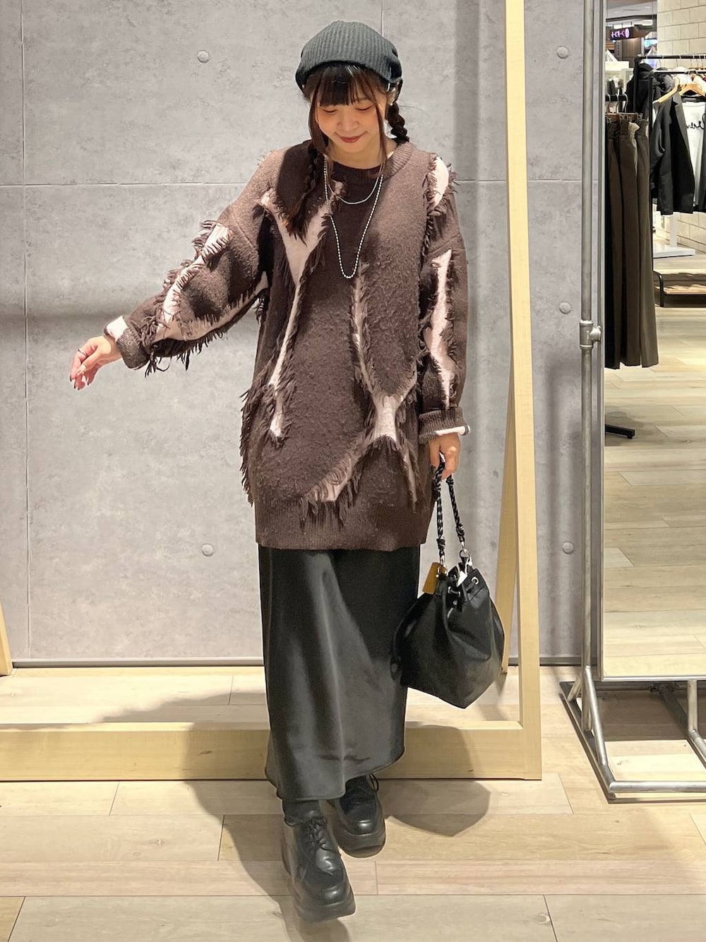 【キレイめカジュアル】 ◎フリンジニットチュニック →ランダムなダメージが可愛い🤎 チクチク感も全くなくておしりもすっぽりカバーしてくれるありがたい丈感🙏 ブラウン×ピンクの組み合わせも今年っぽくて◎ カジュアルになり過ぎないようにツヤ感のあるサテンスカートとアクセを合わせたariのリアルバイコーデです🤍