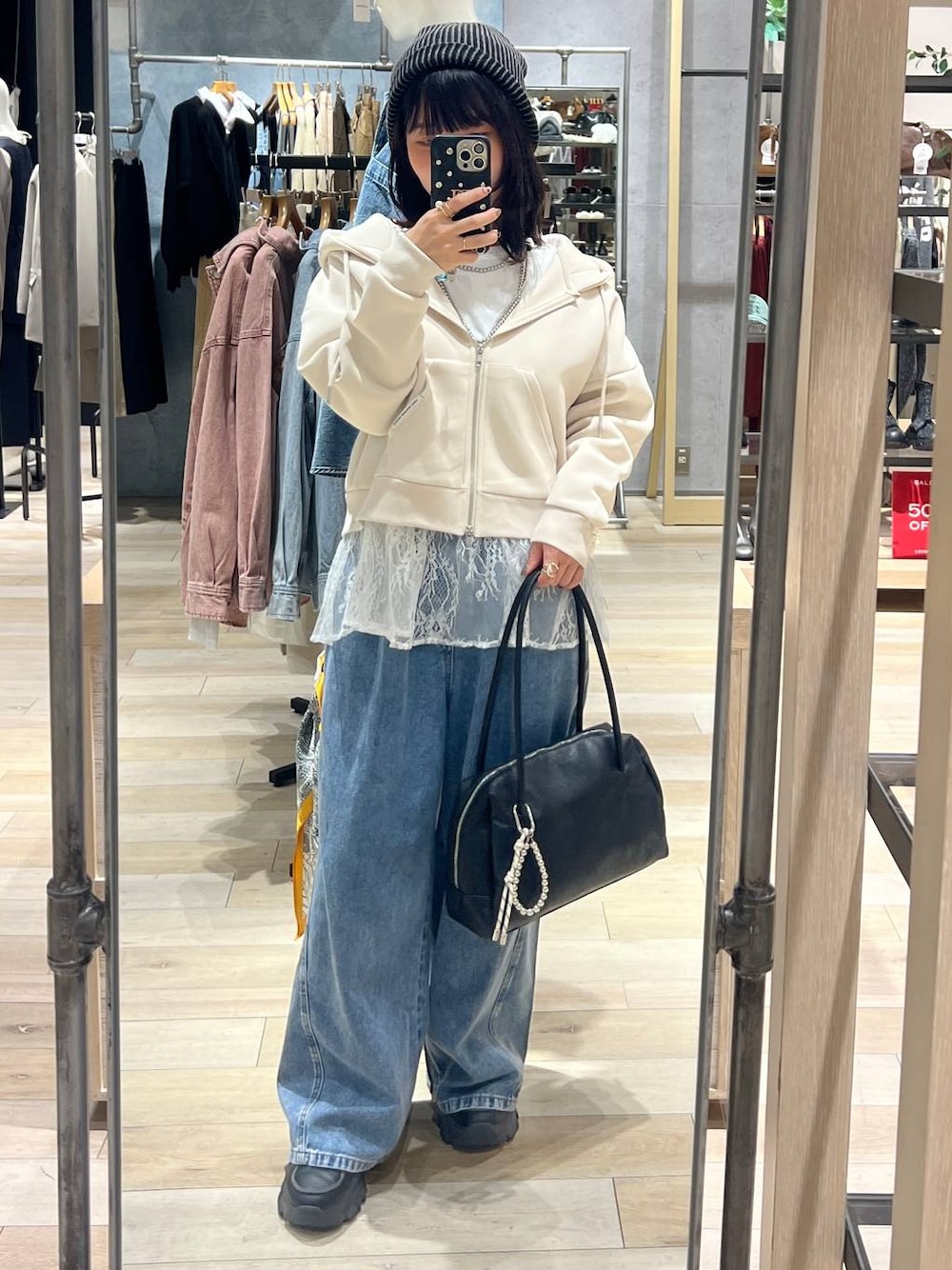【キレイめカジュアル】 大人気のパフエアシリーズのショート丈! 腰上くらいの丈感なので、体型カバーにレースのインナーを重ねるのが今年っぽくもなりおすすめです! デニム×レースが春らしさもUPしてくれます🤍 ◎パフエアショートフーディー ▷▶軽くてもちもち素材のLEPSIM大人気のパフエアシリーズ!BIGフーディーに比べると袖部分がかなりスッキリした印象に!ポケットも前に付いていてデザイン性◎です!