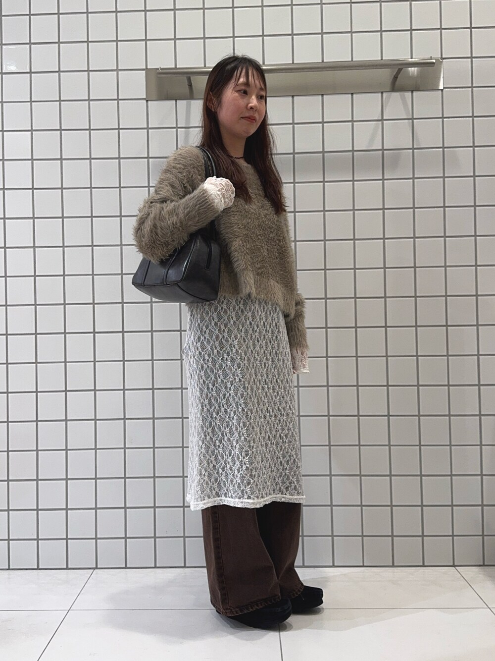ボートネックで首元スッキリしたデザインのシャギーセーターは綺麗めでも使えます! レースのワンピースをレイヤードしてトレンドも◎