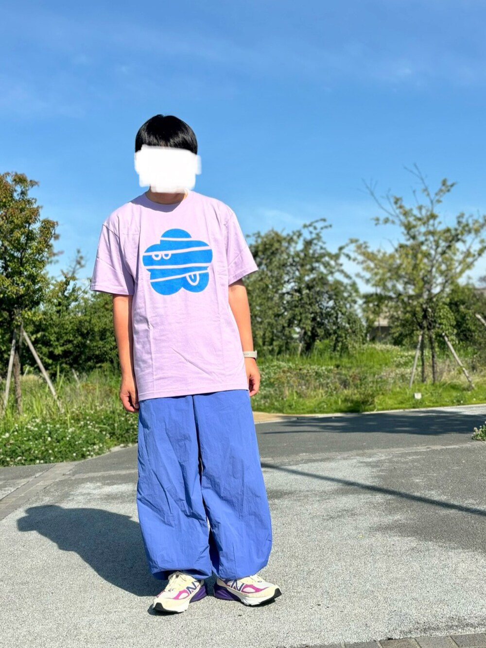 トップス:FRAPBOISパークマークT(パープル) パンツ:FRAPBOISパラシューパンツ(パープル) シューズ:ニューバランス990V6(マゼンダ)
