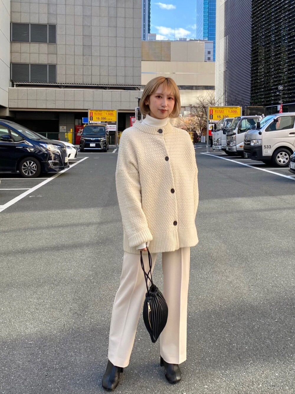 ビッグシルエットのカーディガンを主役にしたワントーンコーデ。 着用アイテム:鹿の子カーデ サイズ感:ビッグシルエットでお尻まですっぽり隠れる丈感です。 着心地:チクチクしなくて着心地良いです。とても暖かいです。 着用アイテム:ミラノリブニット サイズ感:程よくジャストでボディラインを拾わないシルエットです。 着心地:チクチクしなくて着心地良いです! 着用アイテム:パンツ サイズ感:Sサイズ着用。程よくゆったりしていてボディラインを拾わないです。 着心地:ウエストがゴムになっていて楽な履き心地です!