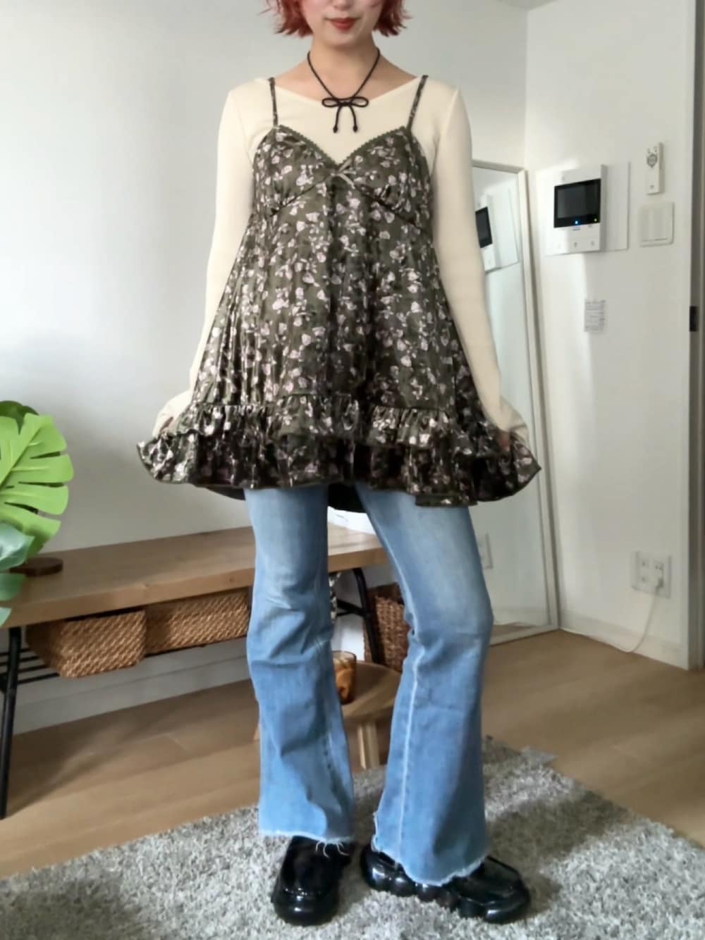 arisa okita(CIAOPANIC)のチュニック「ベロアフラワーキャミチュニックワンピース」を使ったコーディネート