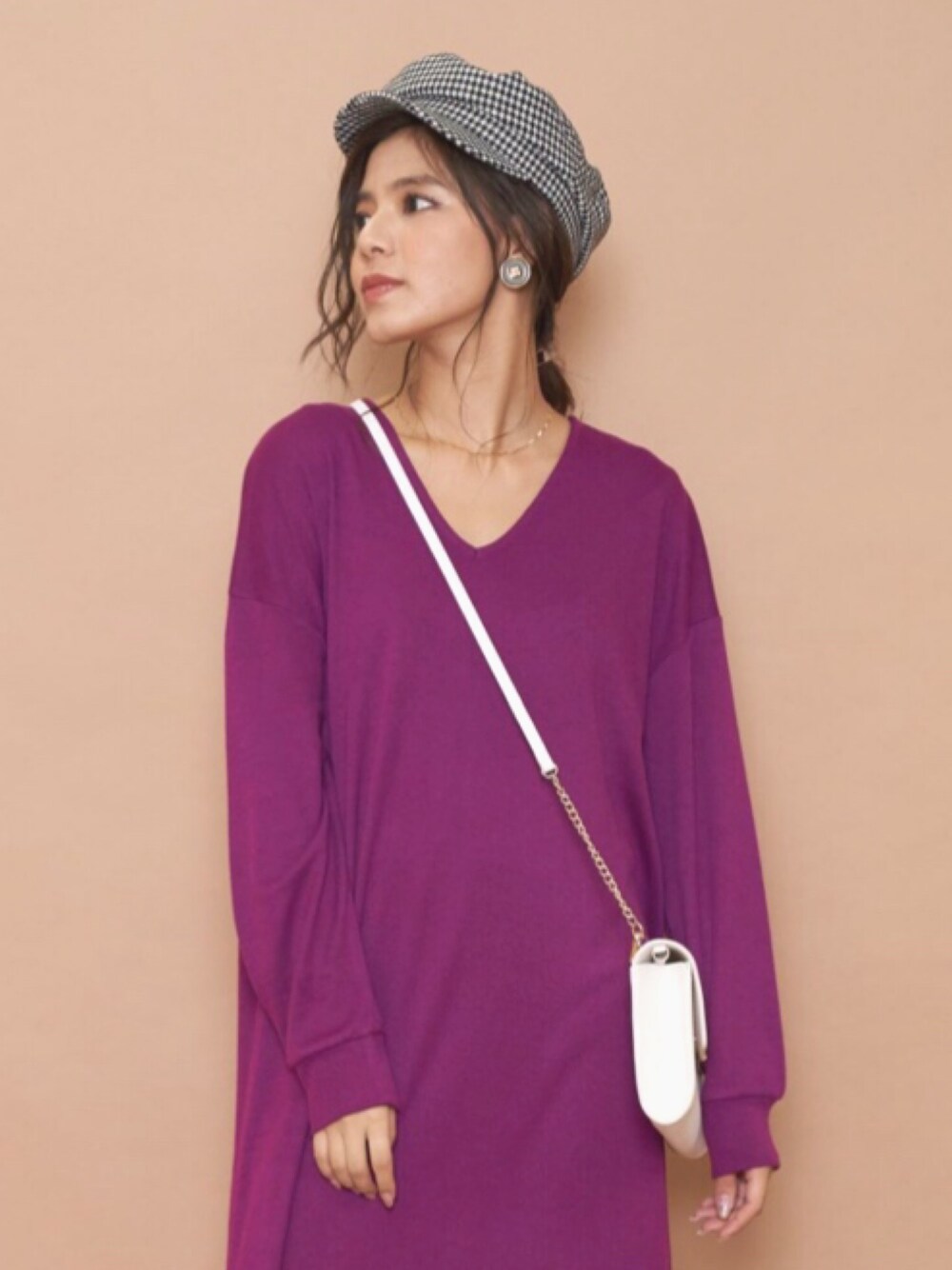 パープル系のワンピース/ドレス、ホワイト系のバッグ、その他のキャスケットを着用したレディースの秋コーディネートの1枚目の写真