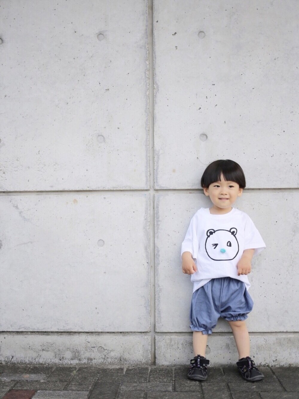父の日コーデ ☺️ igの @baby__dj さんのお洋服 ☺️ クマのお鼻ポンポンで飛び出てるよ。🐻 かぼちゃパンツも春夏素材でかわいいよ。💓 三週間ぶりの親子ショット載せてます ☺️ 二人とも嬉しそうでした! よかった! 憧れてたちょっとおしゃれっぽい壁の前でやっと撮れた🤤笑 いつもありがとうございます😊