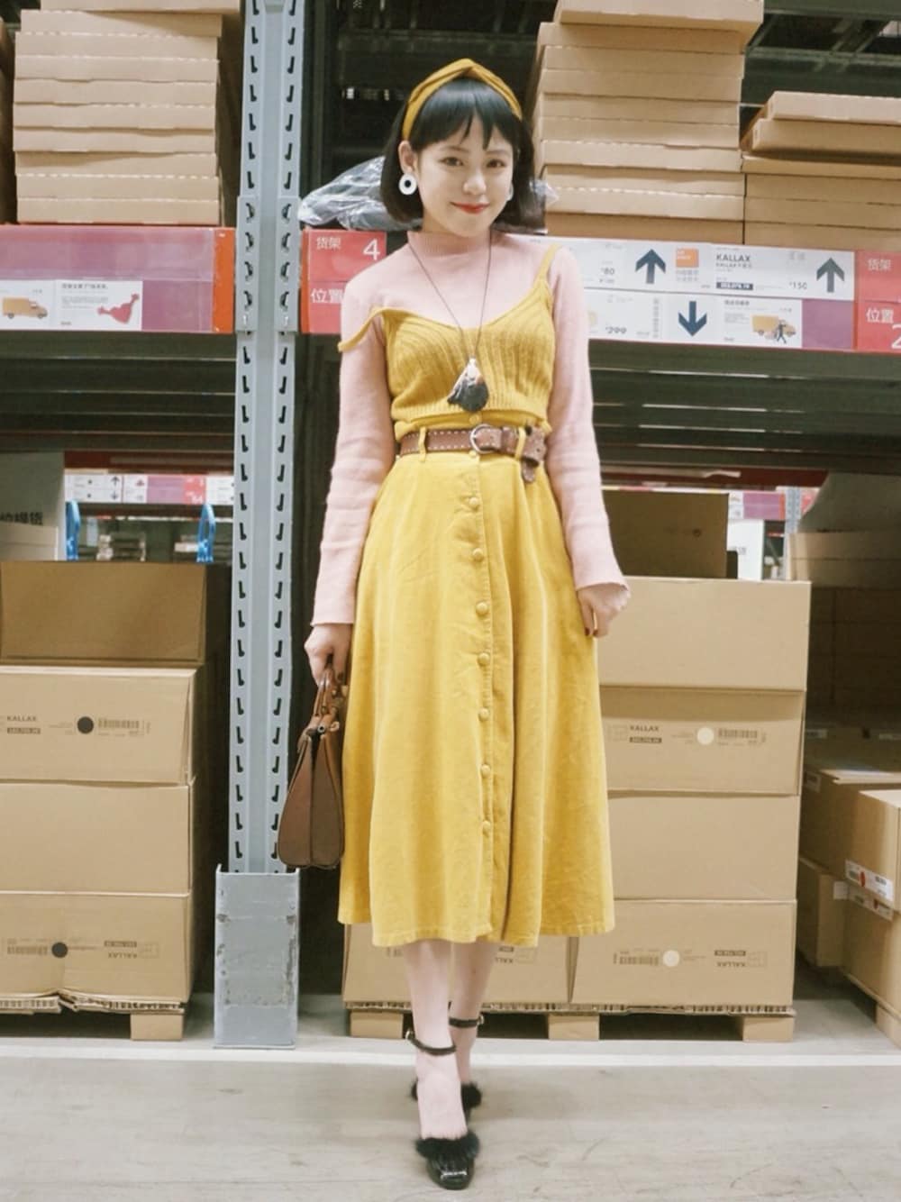 ブラウン系のハンドバッグ、イエロー系のスカートを着用したレディースの冬コーディネートの1枚目の写真