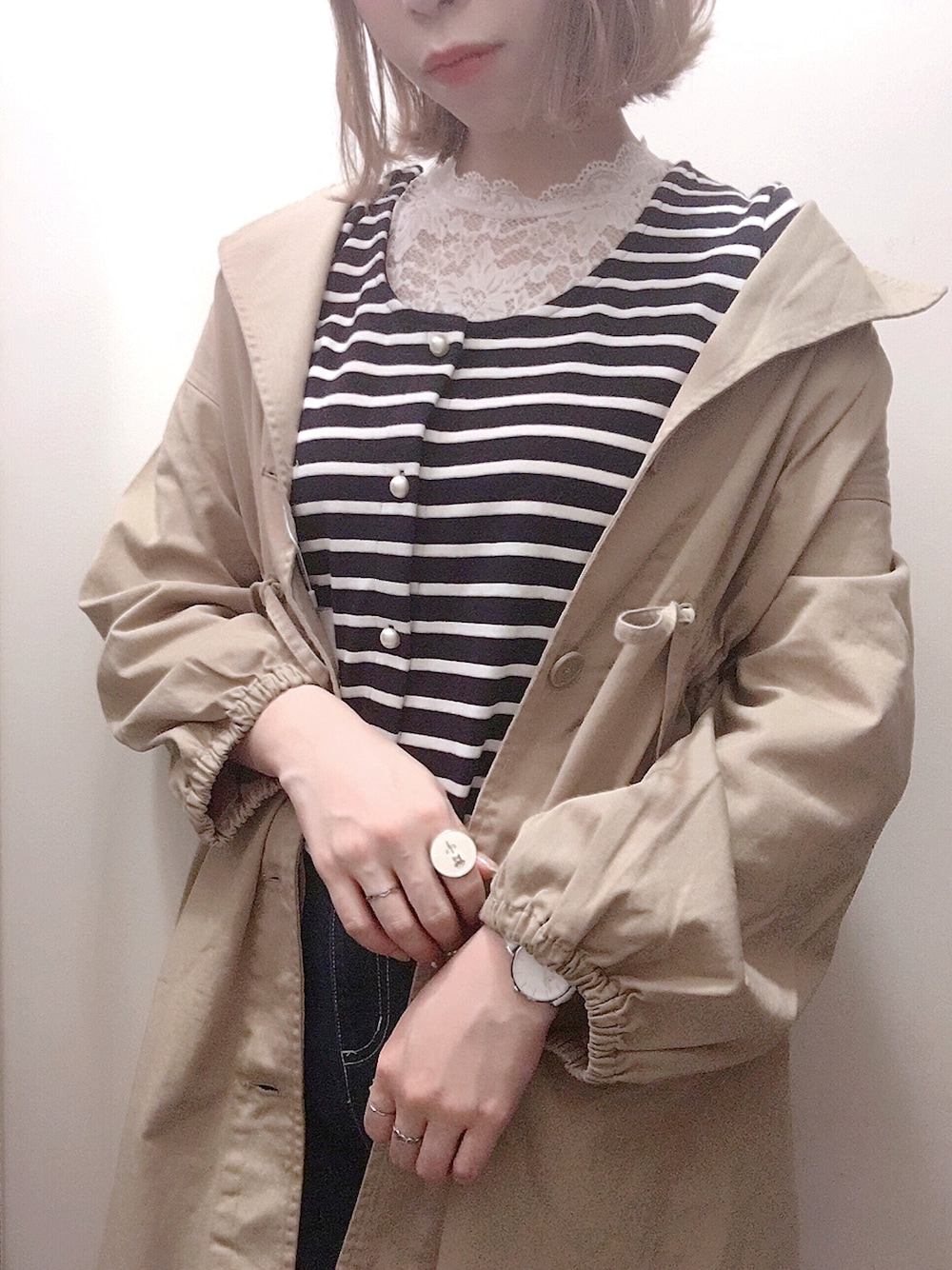 ボーダー×モッズコートのカジュアルコーデに チラ見せするレース、、💭💗 おんなっぽさが増すのでオススメ💋