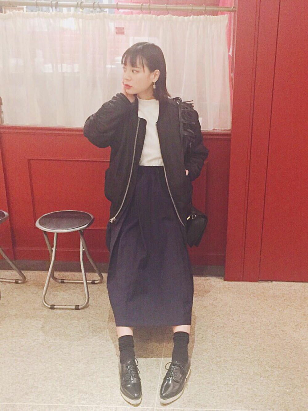 シンプルコーデ♡ スカートですが全体的にモノトーンにして可愛くなりすぎないように(o^^o)