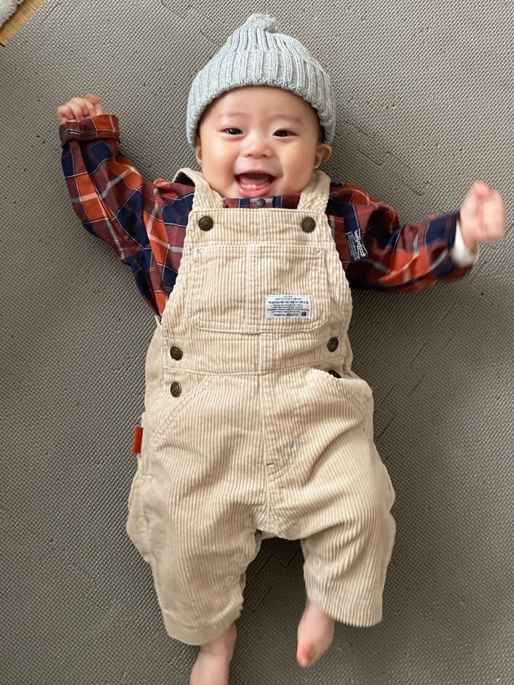 ハゲちゃんだから帽子必須🧢 ●ニット帽 500円 ●チェックシャツ 2570円(セール) ※セットアップなので、半額分の1285円で計算 ●サロペット 1900円(セール/70センチ) 合計3685円