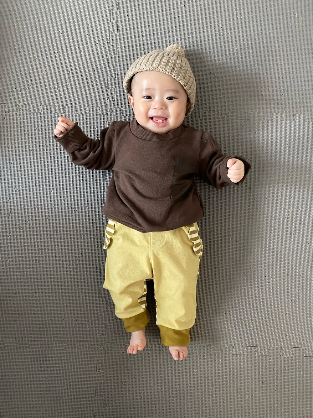 うしろ姿が特にかわいい😍 オール西松屋コーデです。 ●ニット帽 500円 ●ポケット付きトレーナー 649円 ●くまズボン 649円 合計 1798円