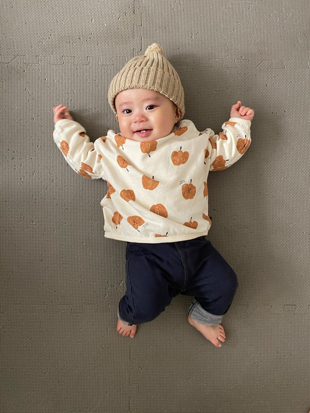 今日はなんだか大胆なポージング ●ニット帽 500円 ●パプリカトレーナー 890円 ●デニム風レギンス 590円(セール) 合計1,980円