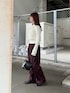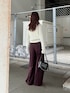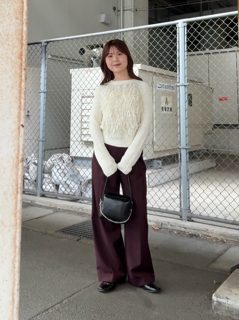 季節感のでるボルドーカラーのスラックスがポイントのコーデです🍇 トップスは、すっきりとしたサイズ感なのでワイドなボトムスを合わせても可愛いです! シルエットがタイトめなので、フリンジのデザインでも着膨れしないです^^