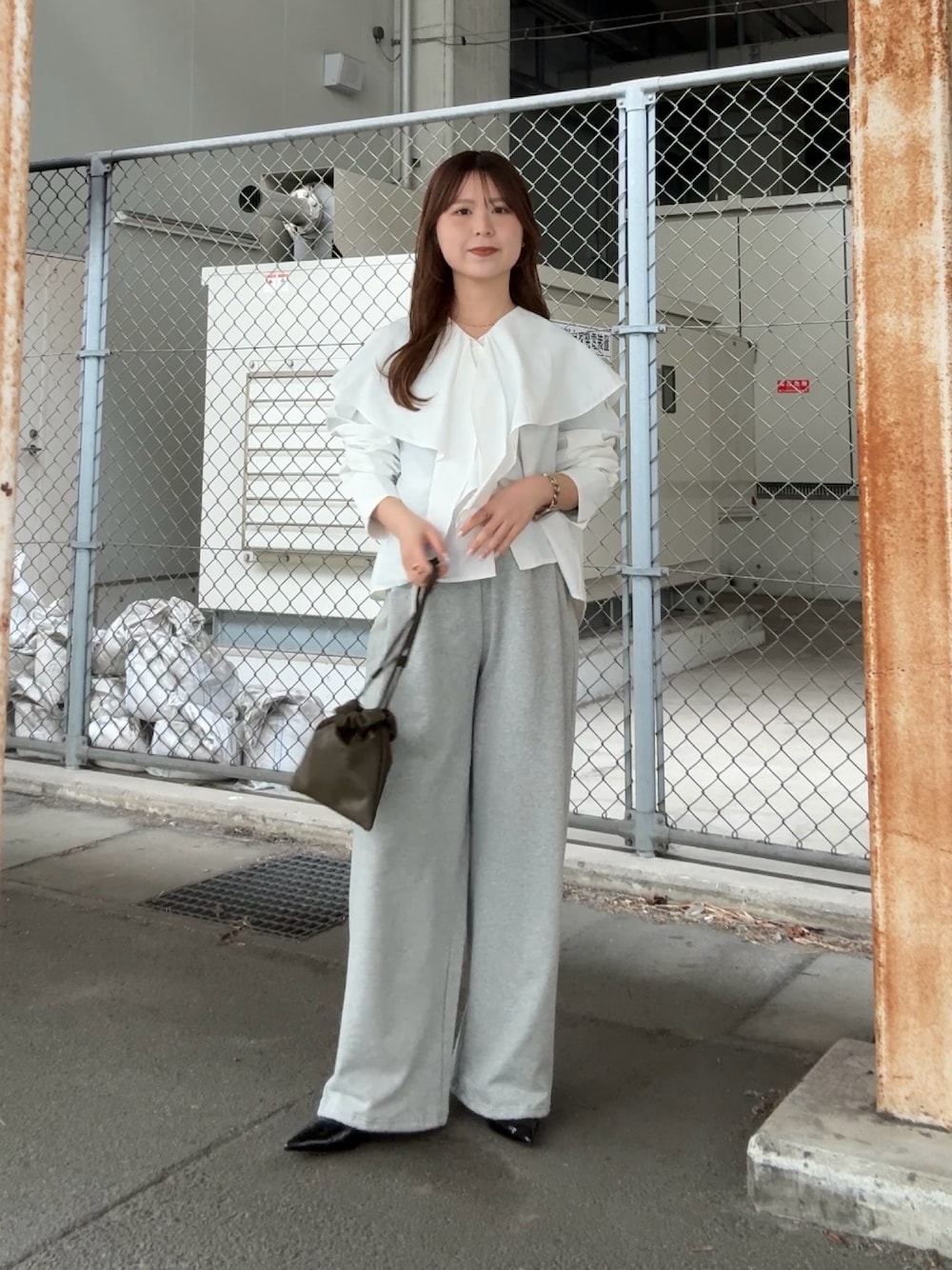 華やかなオケージョンシーンでも使っていただけるブラウスは、 カジュアルなスウェットパンツやデニムでの 合わせが甘くなりすぎなくて好きです🌸 シンプルなコーデだったのでバッグはカーキ色に^^