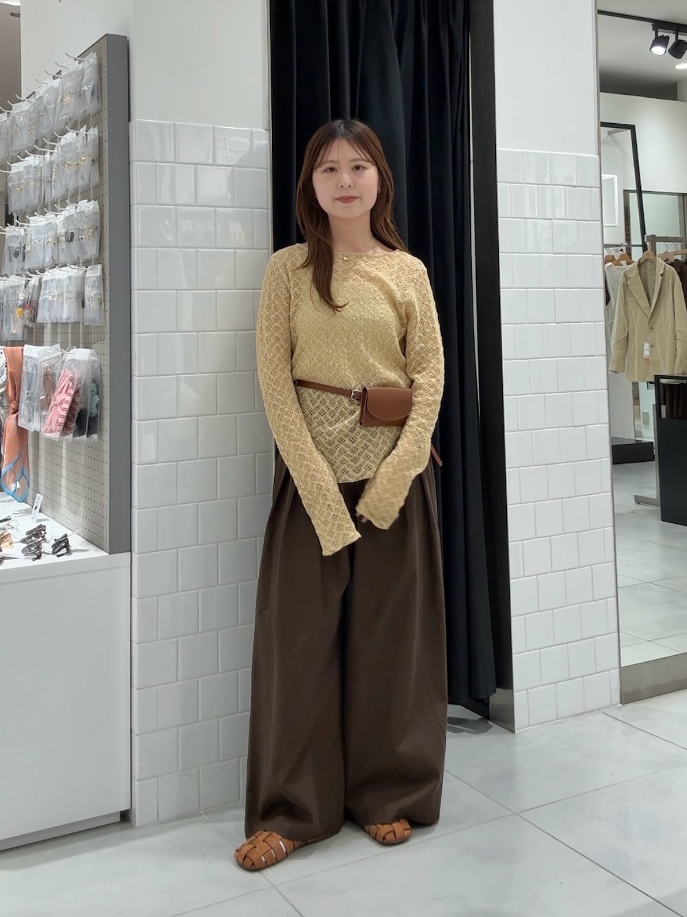 トップスは、透け感がありすぎず タイトすぎずなサイズ感ので 1枚でも着ていただきやすいです! 裾がサイドカットのデザインになっているので アウトのまま着るのも可愛かったです♪ グルカサンダルは、スエード生地なのがトレンドでおすすめです!