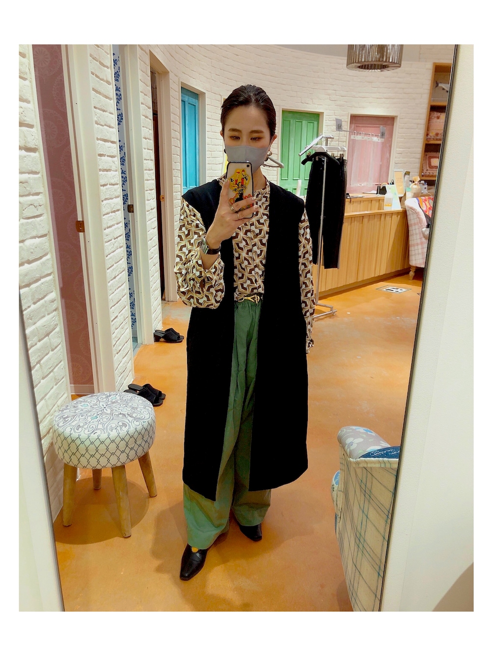 本日の出勤コーデです☺︎ 太めのパンツに柄シャツとジレを 合わせてます. ジレはユイティーム・ニの商品です▶︎