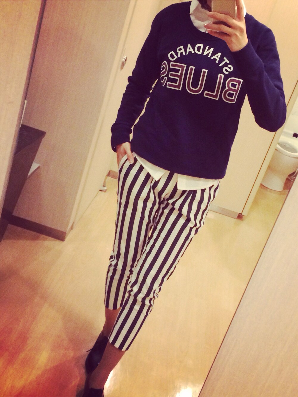 暖かくなったので、クロップドパンツとスウェットで。 ちょこっとキレイ目に。
