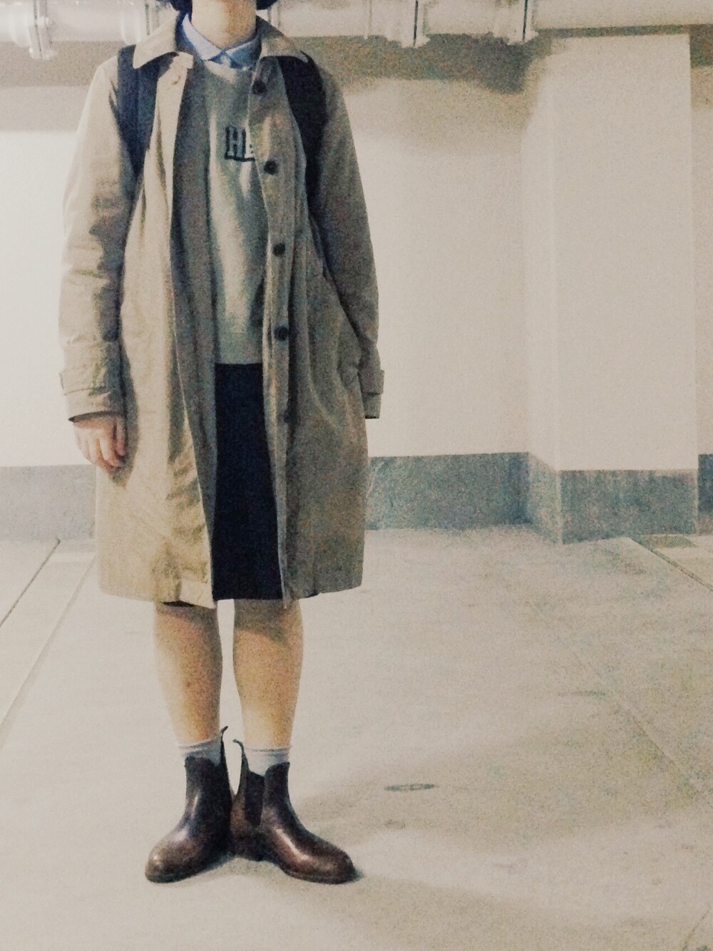 暗いところで撮ったから 画質が荒い( i _ i ) シャツ 無印良品 スウェット BEAMS BOY スカート HUMAN WOMAN コート MHL. 靴 AIGLE 靴下 靴下屋 リュック Herve Chapelier
