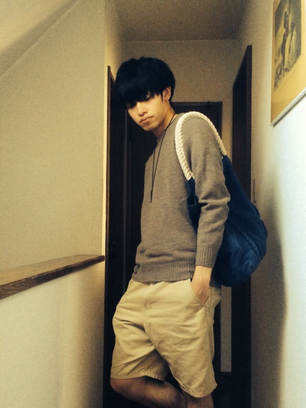 ブラウン系のニット/セーター、ベージュ系のその他パンツを着用したメンズの夏コーディネートの1枚目の写真