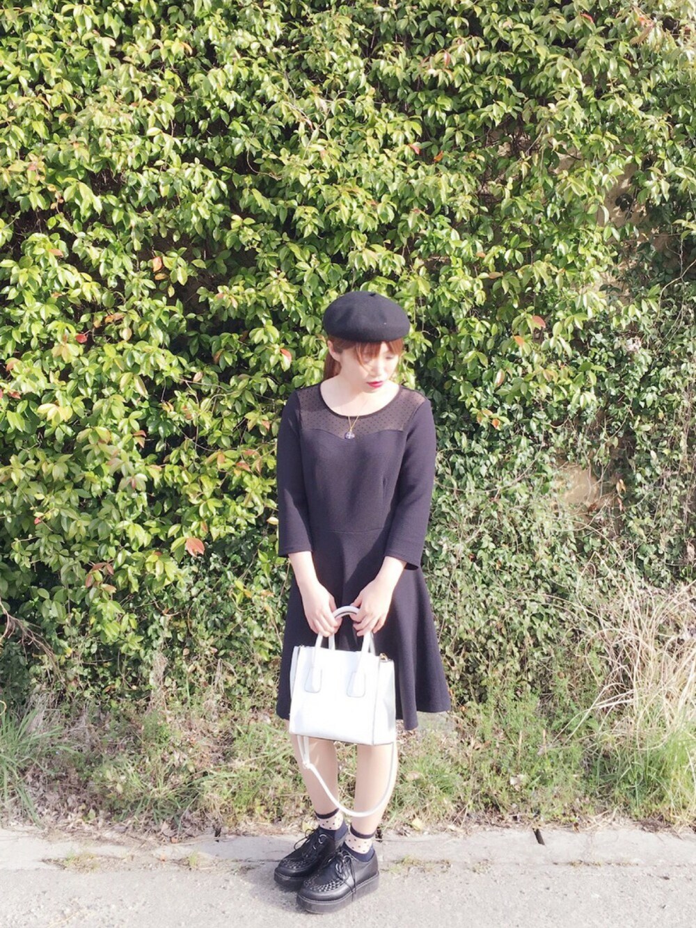 髪の毛切りにいったコーデ(?) これ着ていくつもりだったけど行く直前に寒くて服装変えたので実際は写真の為だけに着たようなものである(笑) バッグ敢えて白にしたけど全部黒にすればよかった! hat:no brand necklace:unrelaxing onepiece:GU bag:GRL socks:no brand shoes:YOSUKE