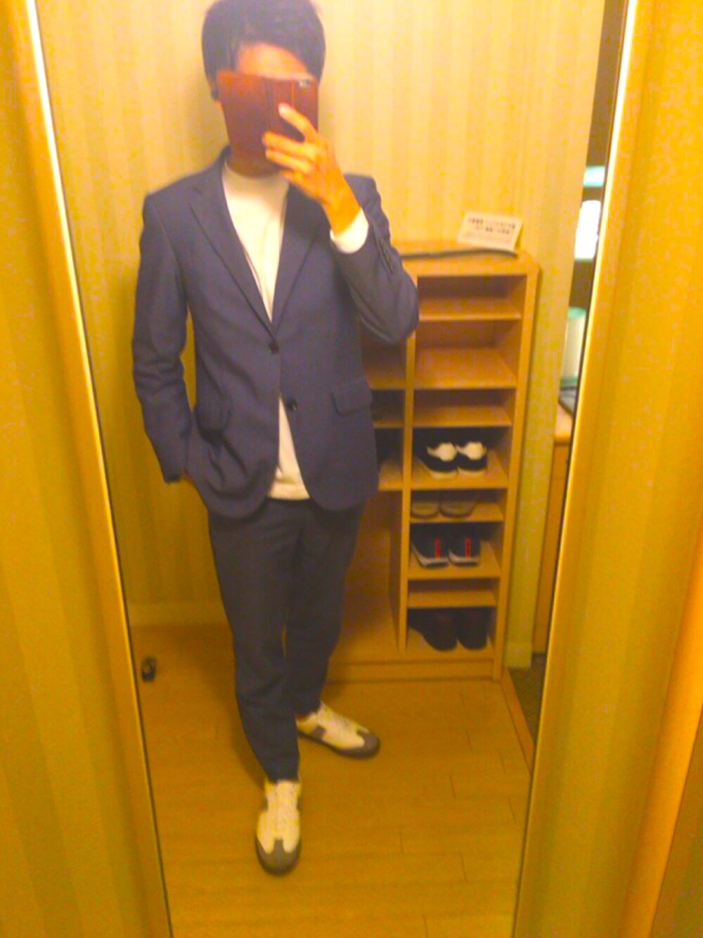 ブルー系のセットアップ、ホワイト系のスニーカーを着用したメンズの秋コーディネートの1枚目の写真