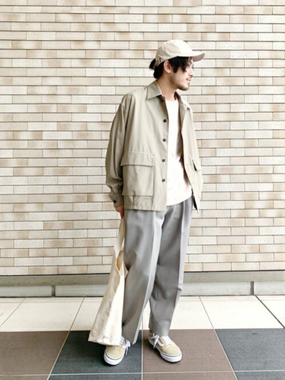 ナチュラルなベージュコーデ。インナーのTシャツは<しっかりとした生地感>と<きれいな色み> が気に入ってます。
