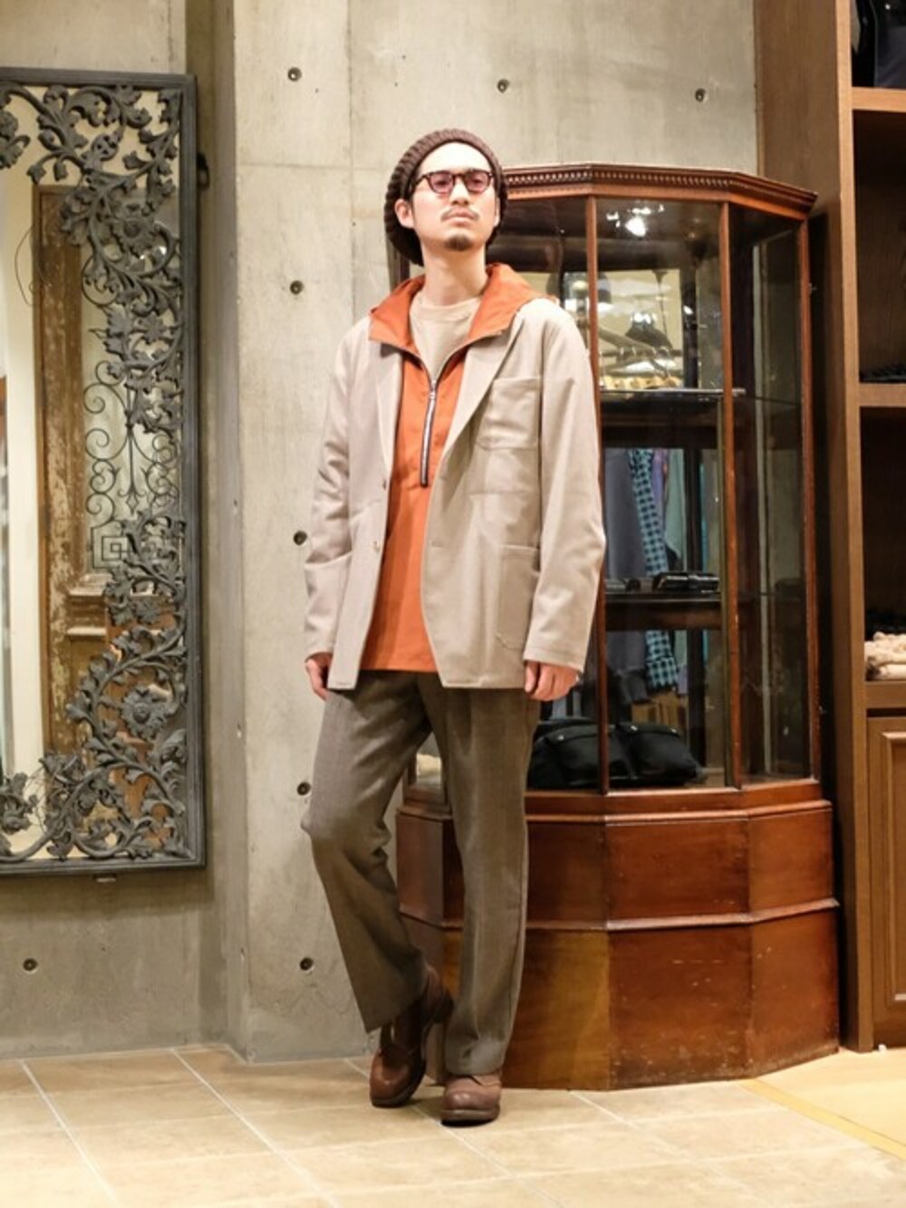 テーラードジャケットに、スラックスと一見クラシカルな合わせですが、インナーには【PORT BY ARK】のミリタリー感、そしてアウトドア感が漂う、Anorak parkaを合わせたミックススタイルに仕上げました。