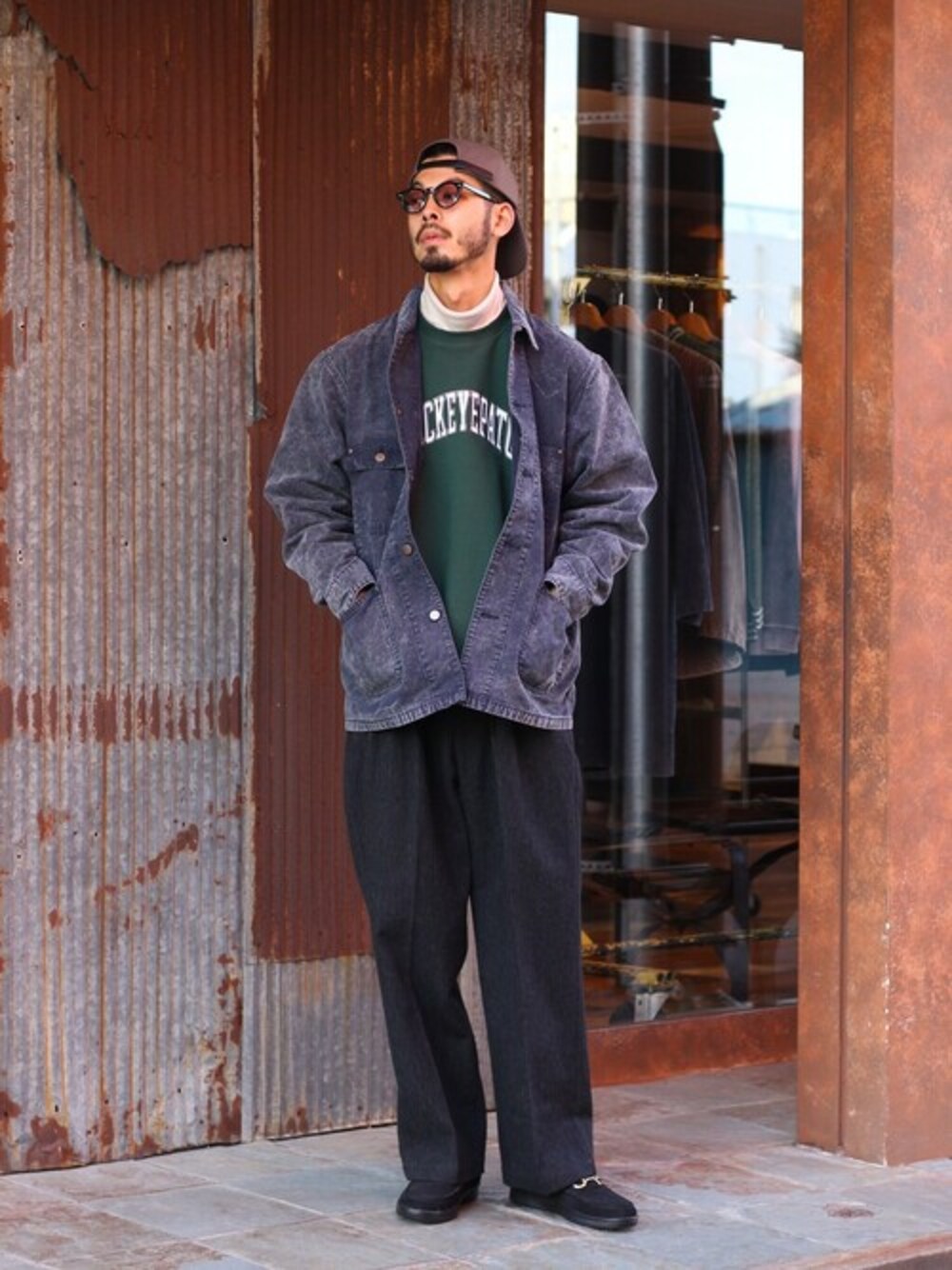 BlackEyePatch〈ブラックアイパッチ〉の別注スウェットを使用したコーディネートを組みました。インナーに着用しているのはmarka〈マーカ〉のハイネック。肌ざわりが良いのでカットソーとしても大抜擢です。アウターにはMASSES 〈マシス〉のカバーオールでインナーのスウェットとの相性も意識しました。パンツにはPORTBYARK〈ポートバイアーク〉のワイドトラウザーで少しBlackEyePatch〈ブラックアイパッチ〉の雰囲気を作り出し、小物を用いてストリートスタイルにしてみました。