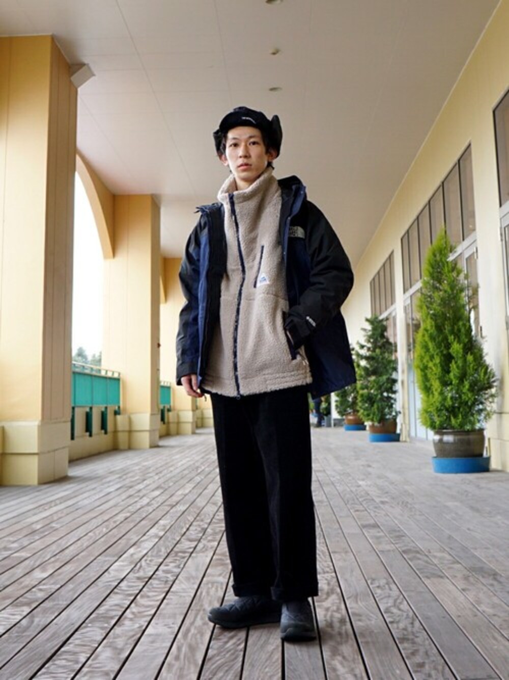 当店自慢のケープハイツの別注フリース! ハイネックの位置設定、ダブルジップ、着用時のシルエットと文句なしの一着。 トップスにはノースの名作マウンテンライトにインディゴデニムをのせたナイロンアウター! フリース×ナイロンアウター