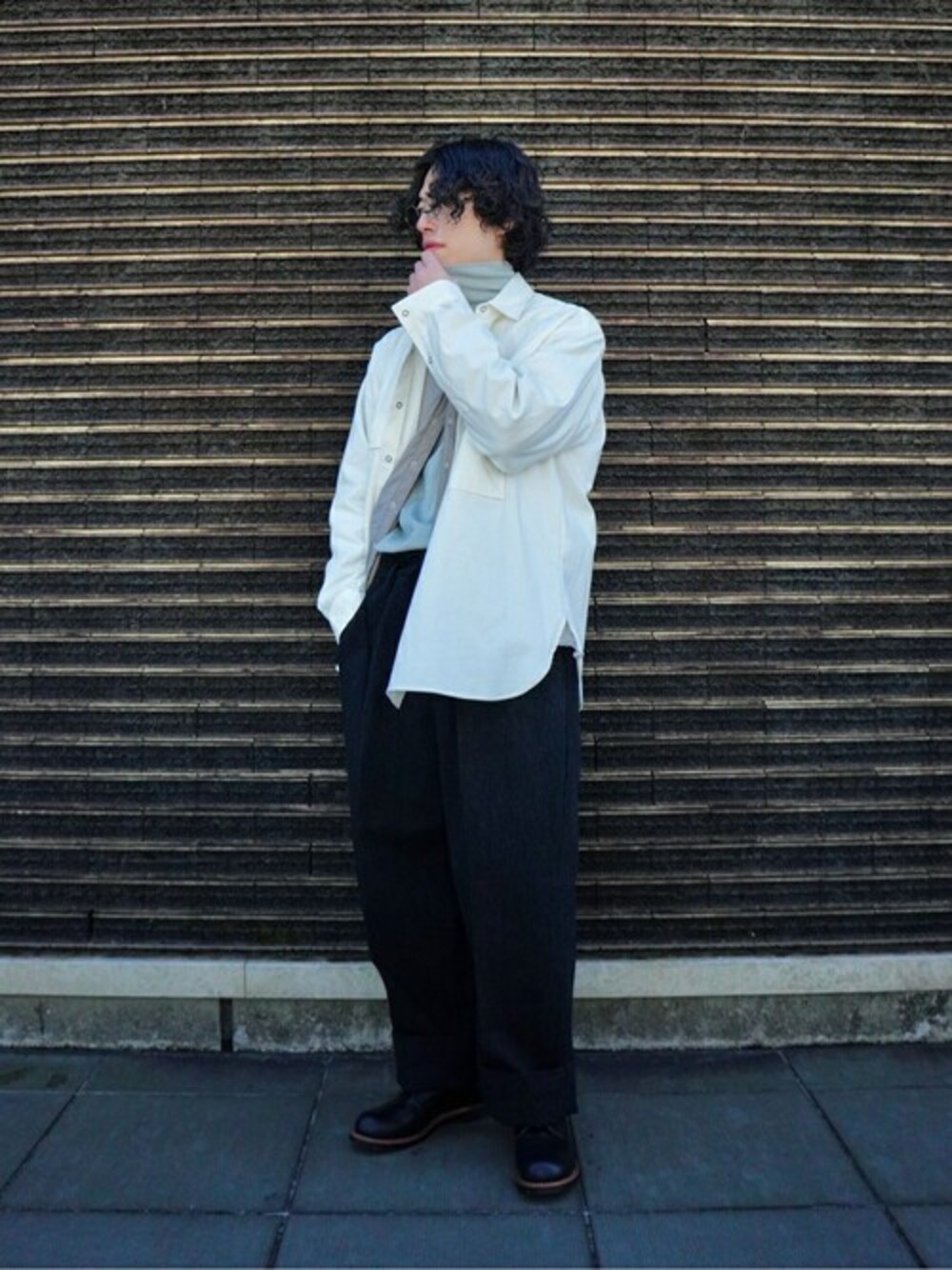 秋冬素材でもカラーによっては春までイケるのがシャツの良さ。厚みもあるのでシャツジャケっぽい着こなしもし易い。