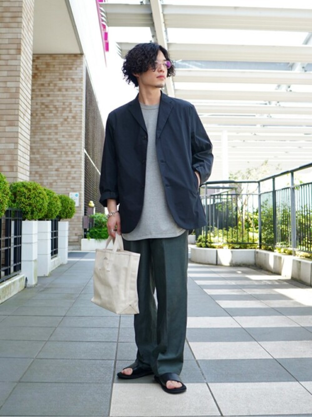 テイジンのストレッチ生地で作ったGOLDの新作ジャケット。ブランドとしては珍しいフォーマルなアイテムでいつもと違った雰囲気を。インナーはレイクタウン店で販売中のグレーカラー。サンダルもレイクタウン店での販売となる表革バージョンです。