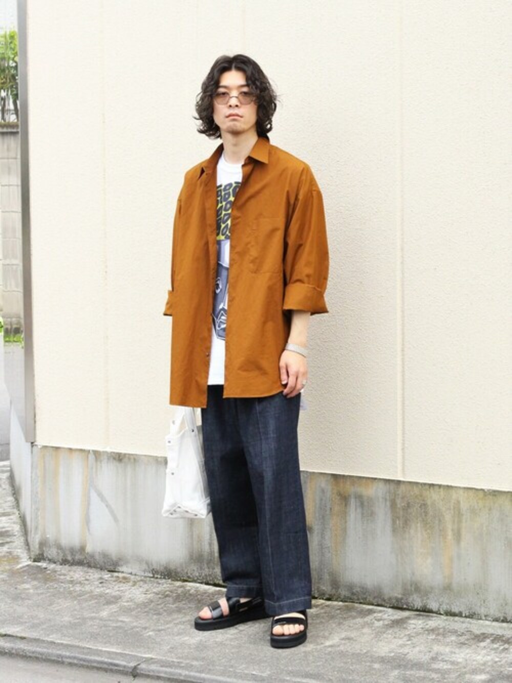 Graphpaper〈グラフペーパー〉のブロード生地を使用したブラウンカラーのシャツを使用してみました。サイズ感もゆったりで秋口なんかパーカーを中に入れても着用できるオーバーサイズシャツ。色味も絶妙です。パンツにはmarka〈マーカ〉のデニム。ストレートシルエットとセンタープレスが綺麗に印象付けます。