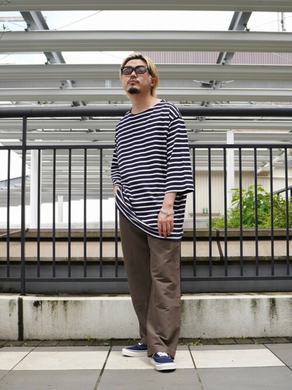バランスの取れたストレートシルエットが魅力的なパンツは PORT BY ARK 。 合わないトップスを探す方が難しのではないかと思える理想的なパンツです。 トップスはリラックス感のある BALLAST ARK のバスクTee。 肌にも張り付かず、夏でも快適に過ごせます。