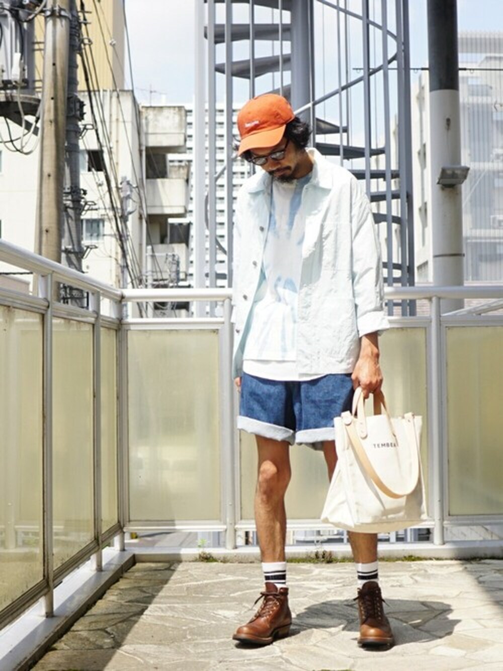 DAIRIKU(ダイリク)のタイダイTeeに GOLD(ゴールド)のナイロンウェザージャケットを合わせて 爽やかに。Graphpaper(グラフペーパー)のショーツをロールアップすることで トップスの丈感とのバランスを整えています。