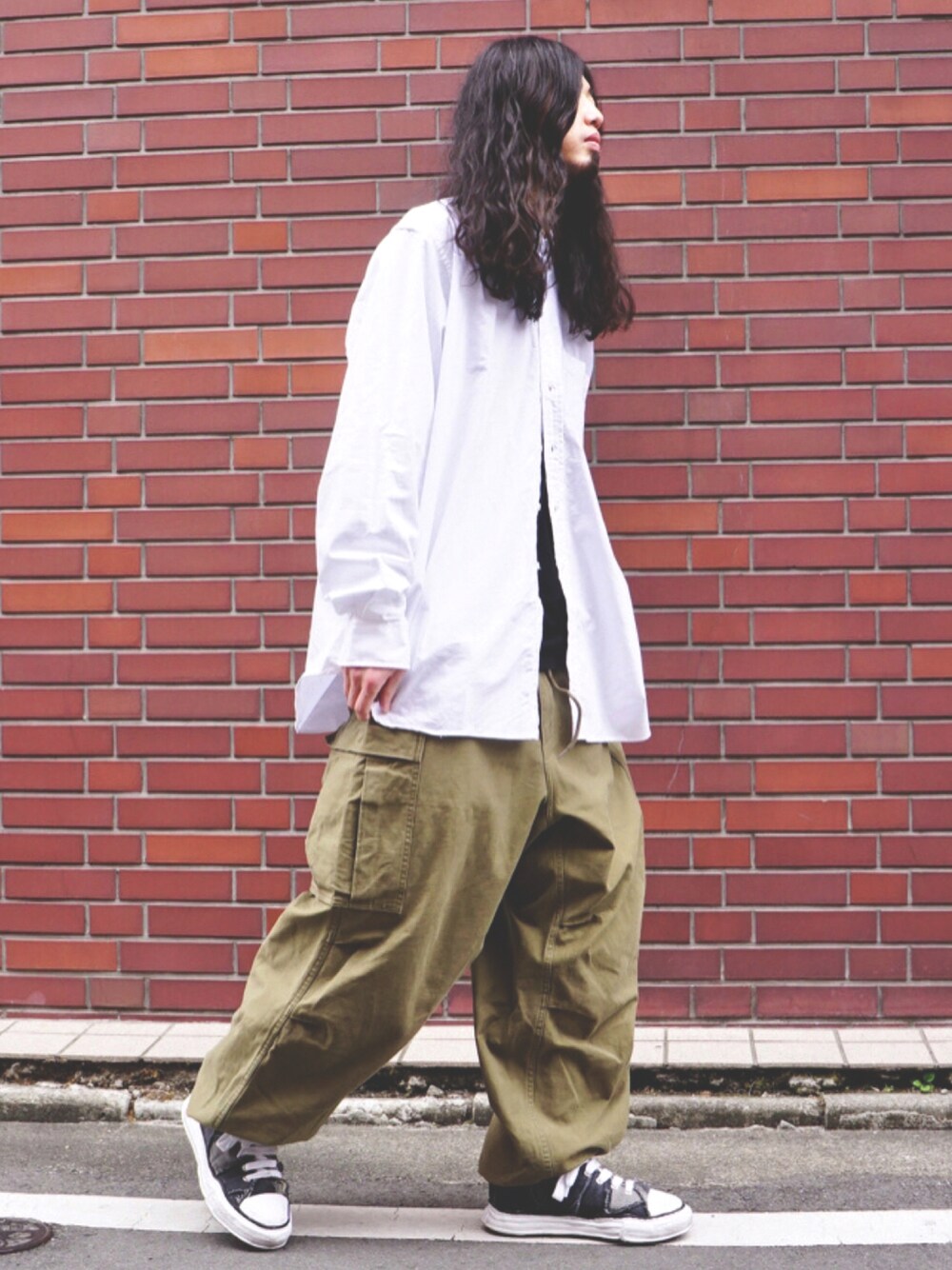ゆったりとしたサイズ感のオーバーサイズのBDシャツにカーゴパンツを合わせた綺麗めスタイリングです◎
