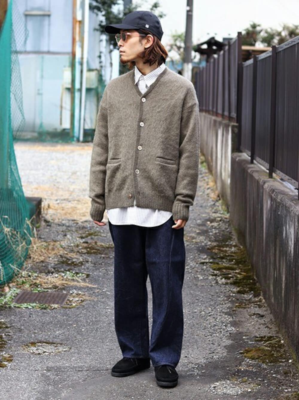 トレンド感もあるPORT BY ARK(ポートバイアーク)のモヘアカーディガンとストライプシャツ(Regular Collar Shirt)をレイヤード。 このスタイルカジュアルにもトラッドにも見えるからおすすめ。