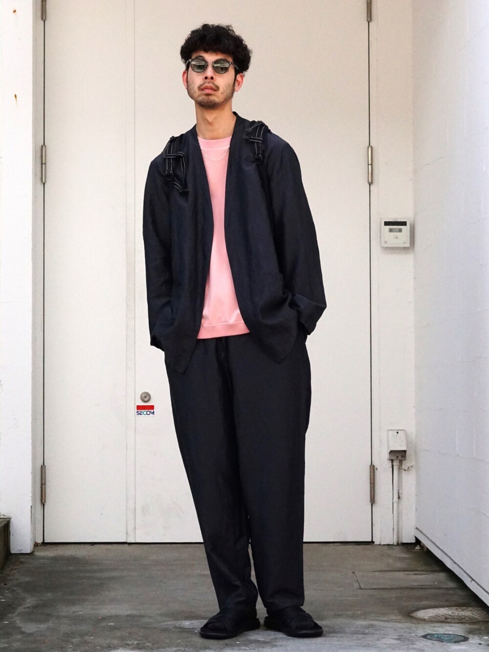 markaの別注セットアップを使用したスタイリング。インナーはTHE NORTH FACE PURPLE LABELを合わせ、Tevaのサンダルを着用。バッグはand wanderの新入荷アイテム、X-Pac 30L backpackです。