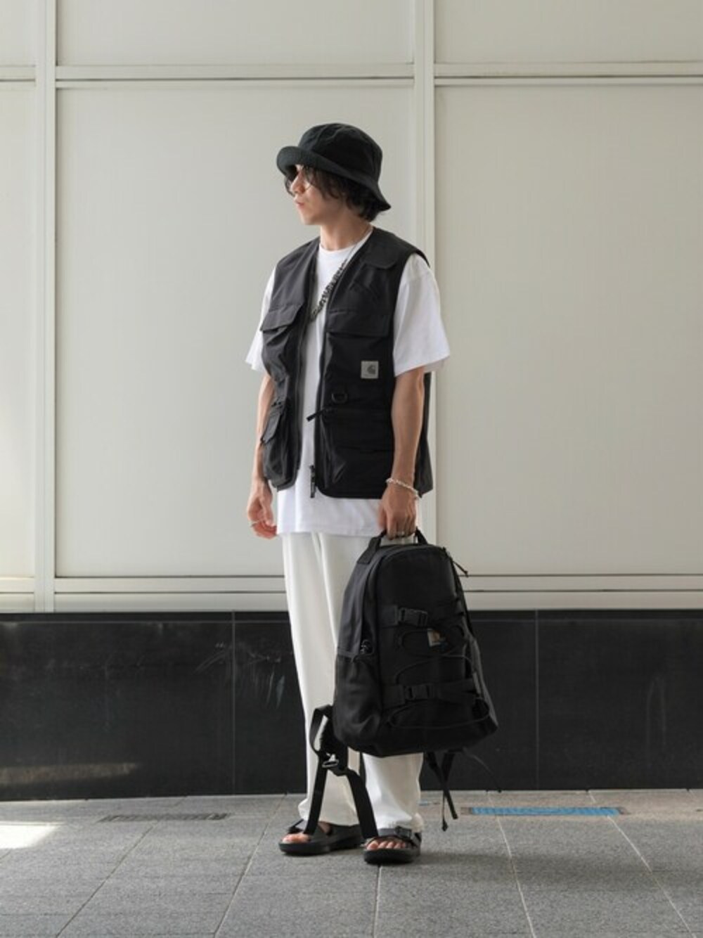 markaのCOCOON FIT JEANSのホワイトを使ったコーディネートです。バケットハット、バックパック、サンダルなどの小物をブラックで統一することで、爽やかな印象を与えるモノトーンコーデになります。