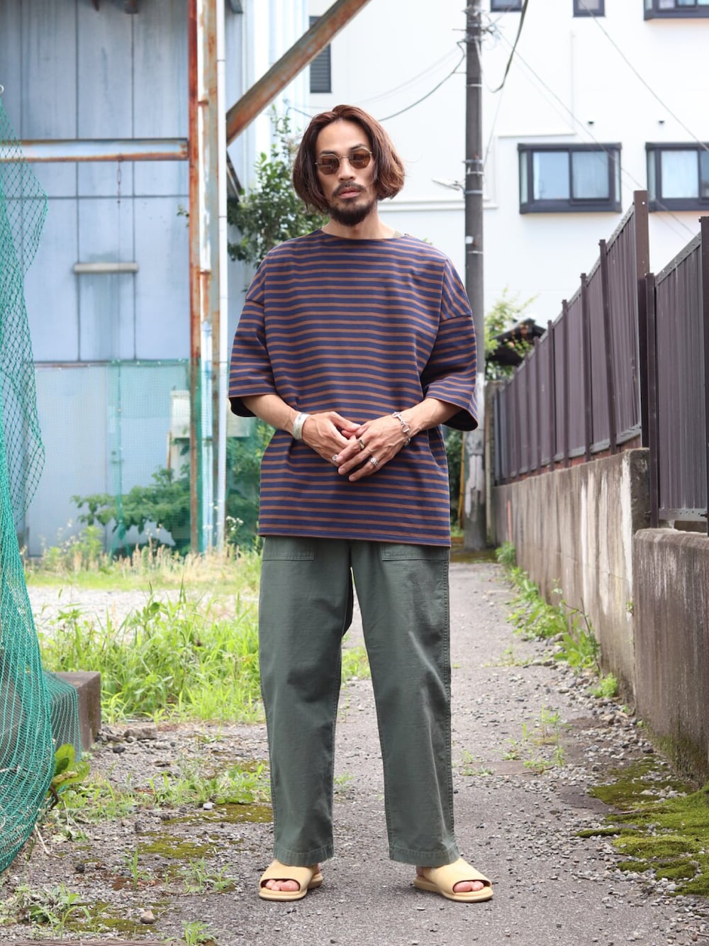 REMI RELIEF NAVY LABEL (レミレリーフ ネイビーレーベル)のベイカーパンツを使ってコーディネートを組んでみました。味わい深いグリーンカラーが夏の装いに最適です。