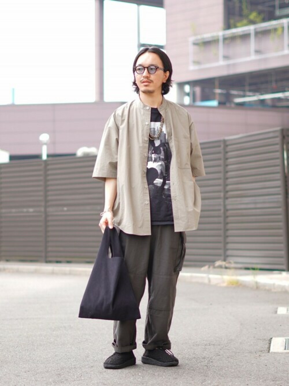 PORT BY ARK (ポートバイアーク)の「Band Collar SS Shirt (バンドカラーショートスリーブシャツ)」でスタイリング。 黒多めのコーディネートですが、ある程度肌を出す事で重くなり過ぎないように。 様々なアイテムとのレイヤードも相性の良い一枚で、こういう時に便利なのでおすすめです。 ゆったりとしたオーバーサイズシルエットでナチュラルなシワ感があり、きれいめなヴィンテージの風合いを表現した一着。