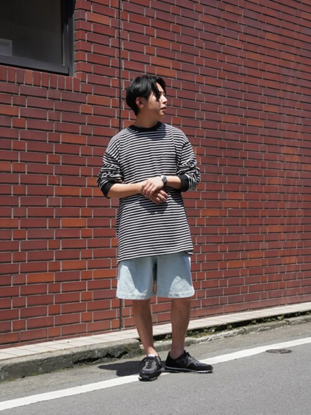 BALLAST ARK(バラストアーク)のゆったりしたボーダーTシャツに、淡いブルーの色味がキレイなE.TAUZ(イートーツ)のデニムショーツで西海岸のストリートスタイルをイメージしたコーディネートです。