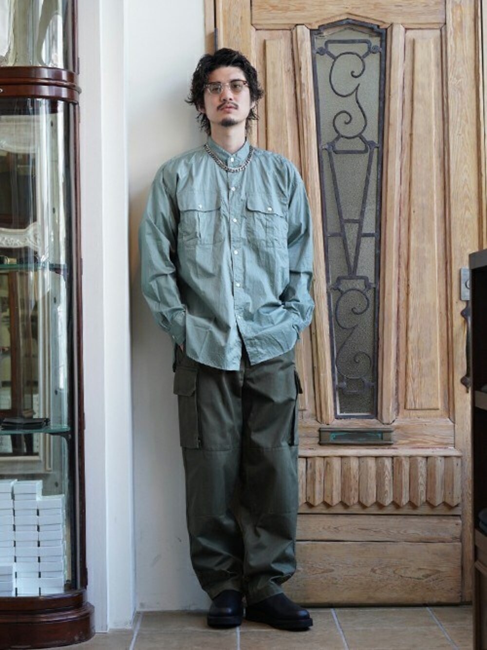 「PORT BY ARK(ポートバイアーク)」のスタンドカラーシャツ、パンツには「AUBERGE(オーベルジュ)」のカーゴパンツ、足元にはブーツを合わせた大人カジュアルなスタイル。