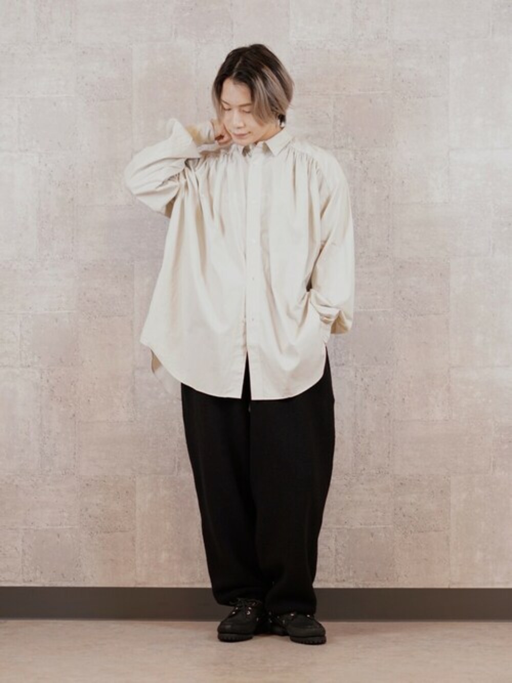コクーンシルエットで提案させていただく、ビッグサイズのギャザーシャツ