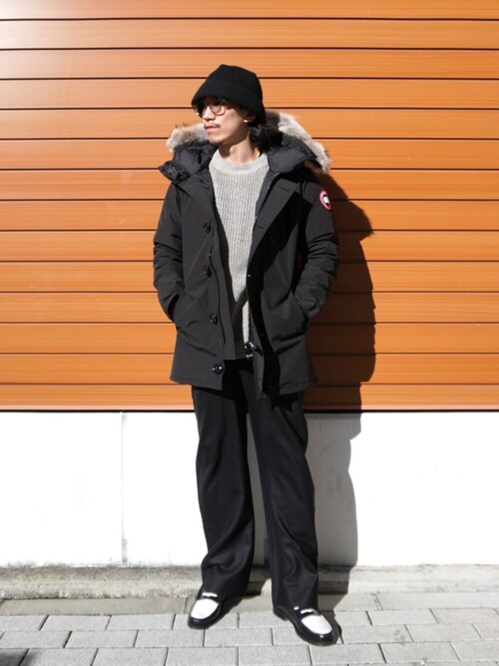 ダウンジャケットのインナーにニットを合わせてスタイリング。
