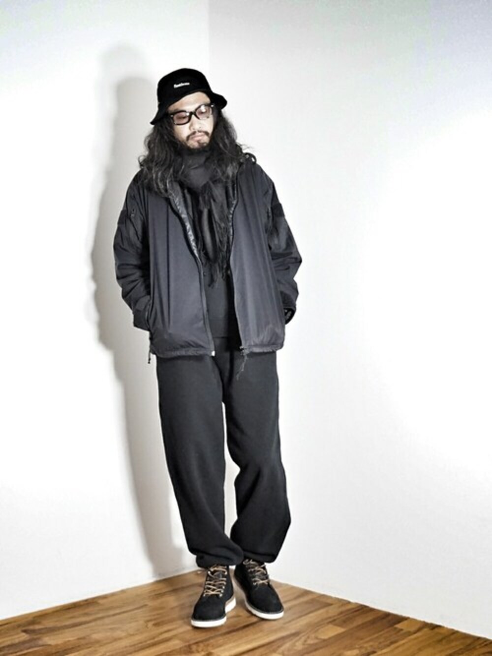 marka × WILD THINGS の LOW LOFT JACKETを基調に GOLDのスウェットセットアップに合わせた オールブラックのスタイリング提案です。