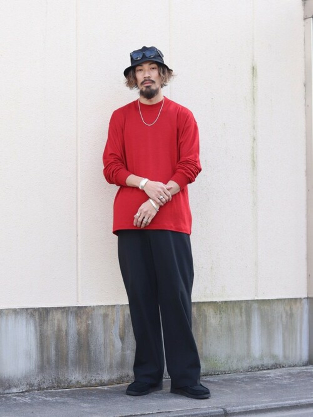 PORT BY ARKの美しい光沢感と滑らかな肌触りが特徴のクルーネックカットソーとブラックのパンツでコーディネートを組んでみました。