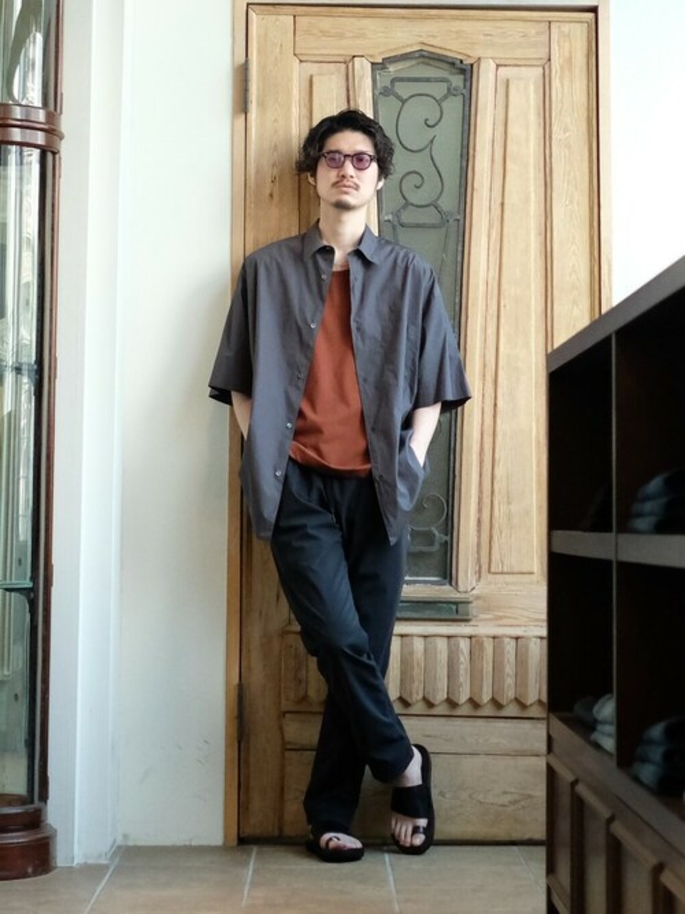 「Graphpaper<グラフペーパー>」のブロード半袖シャツへ、パンツには「TEATORA<テアトラ>」のDRシリーズ、足元には「Jutta Neumann<ユッタニューマン>」のサンダルを合わせた大人カジュアルなスタイル。